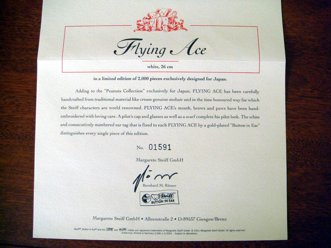 This is the certificate that comes with Flying Ace Snoopy spelling out the details of his construction and quantity. | ||